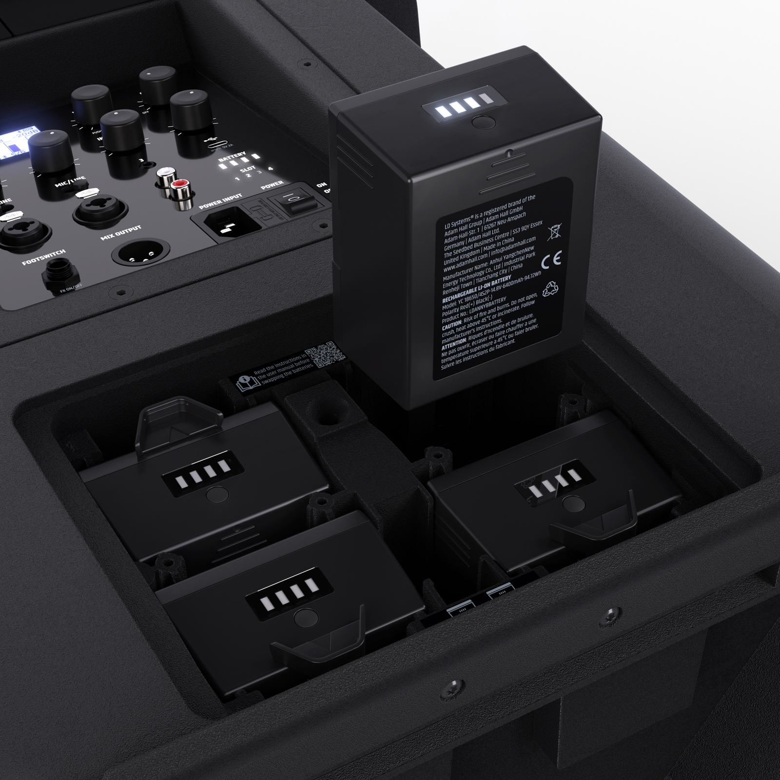 Sistemul include 4 baterii cu funcție hot-swap, permițând utilizarea continuă fără întrerupere. Atâta timp cât o baterie este conectată, boxa funcționează la capacitate maximă.